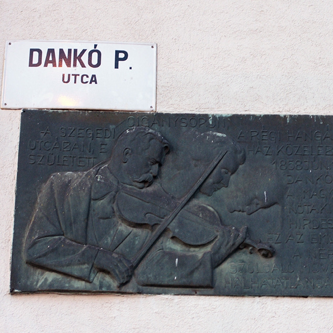 Dankó Pista domborműve Szegeden a József Attila sugárút 43-ban (a Dankó P. utcai oldalon) található. Felállítását Csongor Győző kezdeményezte, a kivitelező Tápai Antal volt. A műemléket a cigány nótaszerző születésének centenáriumán adták át, 1958. június 14-én. Az emléktábla szövege: A szegedi cigánysoron a régi Hangász utcában e ház közelében született 1858. jún. 14-én Dankó Pista, „a magyar nótakirály”. Hirdesse ez az emlékmű a népet szolgáló művész halhatatlanságát
