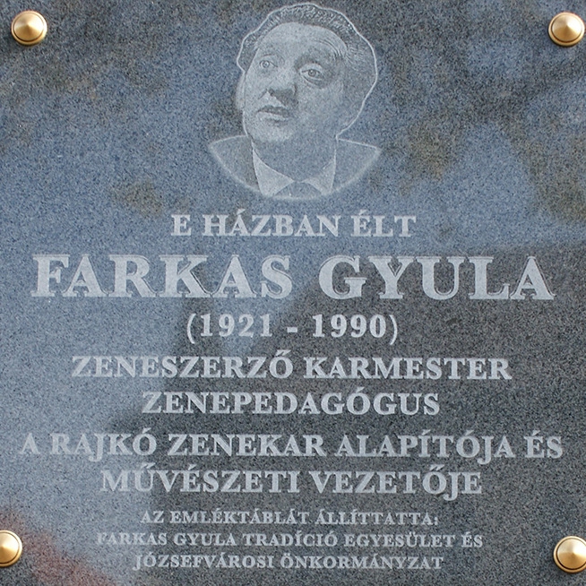 A VIII. kerületben, a József körút 46. ház falán található Farkas Gyula emléktáblája, aki 1921-ben Budapesten született és 1990-ben hunyt el, roma származású hegedűművész, zeneszerző, karmester és zenepedagógus volt.