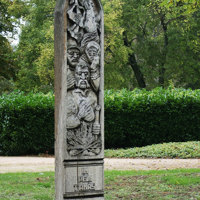 Péli Tamás emlékkopjafája Tiszadobon, az Andrássy-kastély kertjében található.