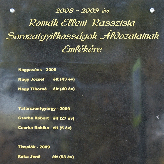 A romák elleni 2008/2009-es gyilkosságsorozatra emlékező táblát, , 2018.11.03-án helyezték ki Miskolcon, a települési roma önkormányzat épületének falán, a Baross utcában.