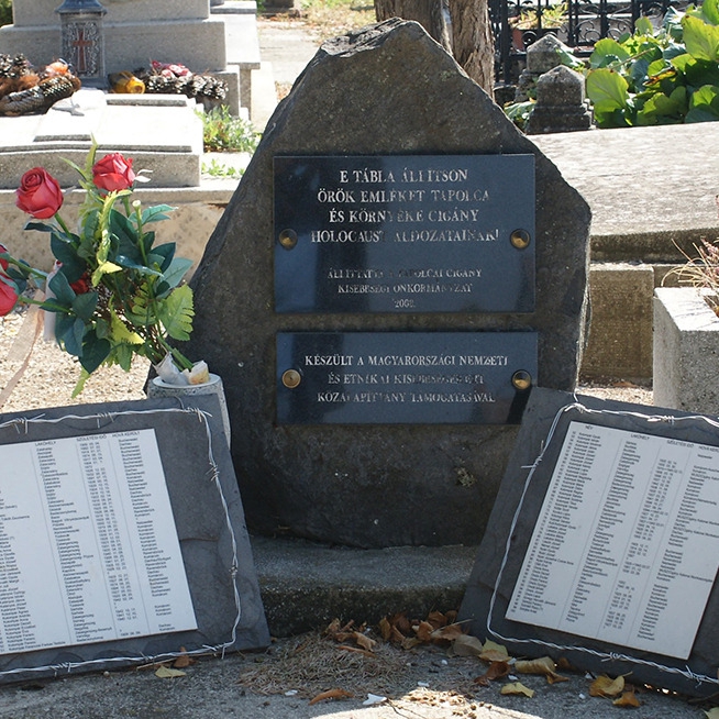 A cigány holokauszt tapolcai és környéki áldozatainak emléket állító emlékművet a tapolcai régi temetőben (Dózsa György út 5.) állítottak fel 2008-ban. Az emlékmű állíttatója a Tapolcai Cigány Kisebbségi Önkormányzat volt, de támogatta a Magyarországi Nemzeti és Etnikai Kisebbségekért Közalapítvány is. Összesen 99 áldozat nevét és lakóhelyét sorolja fel, legtöbbször feltüntetve a születési időpontot is, és hogy melyik koncentrációs táborba került.