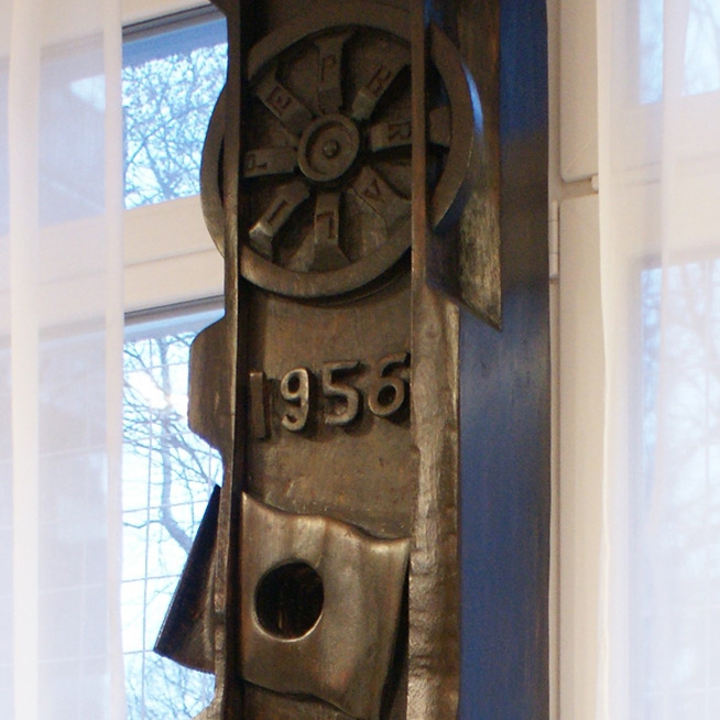 A műnek volt egy 1996-ban átadott, 100×130 cm-es bronz változata, amit elloptak. Ezért felkérték a szobrászművészt, hogy készítse el az eredeti alkotás kő változatát.